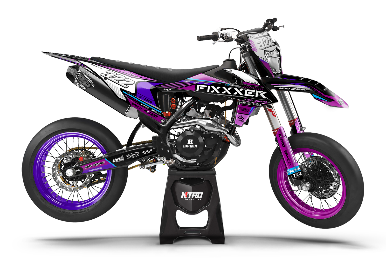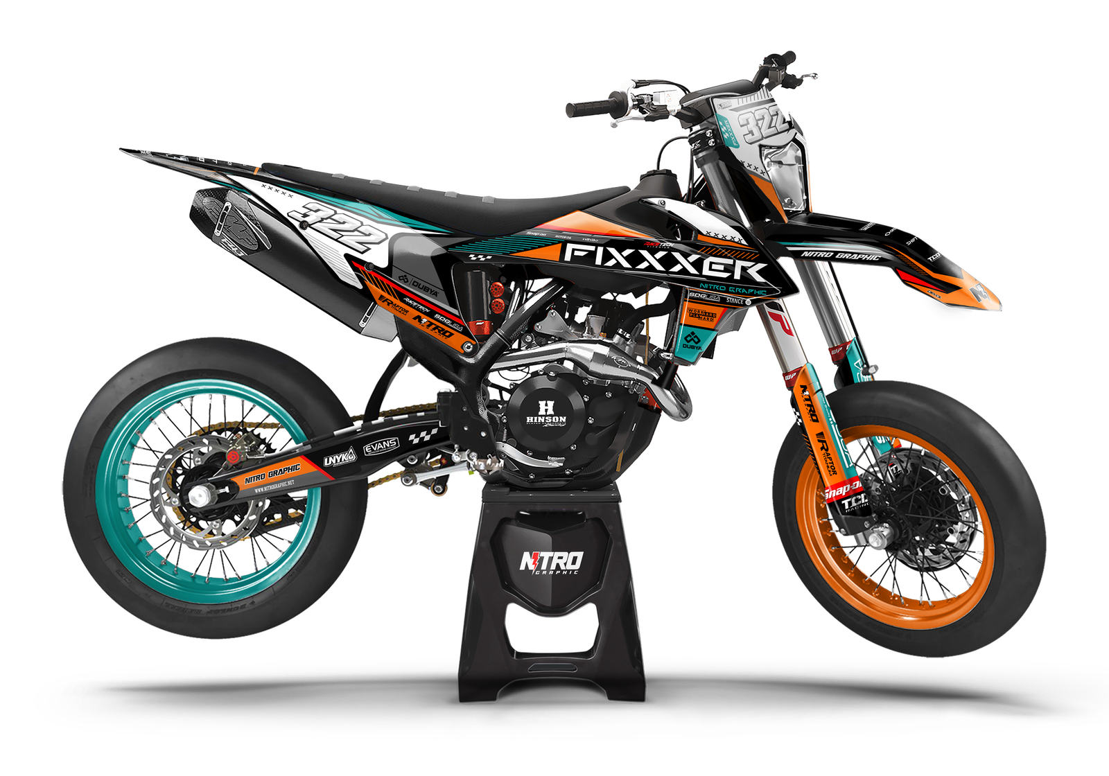 Full Graphics Kits include pre-designed template graphics for – Tank Shrouds / Fuel Tank, Side Number Plates, Airbox, Rear Fender, Front Fender, Front Number Plate Fork Guards, and Swingarms (Contents may vary dependant on Type / Model selected).