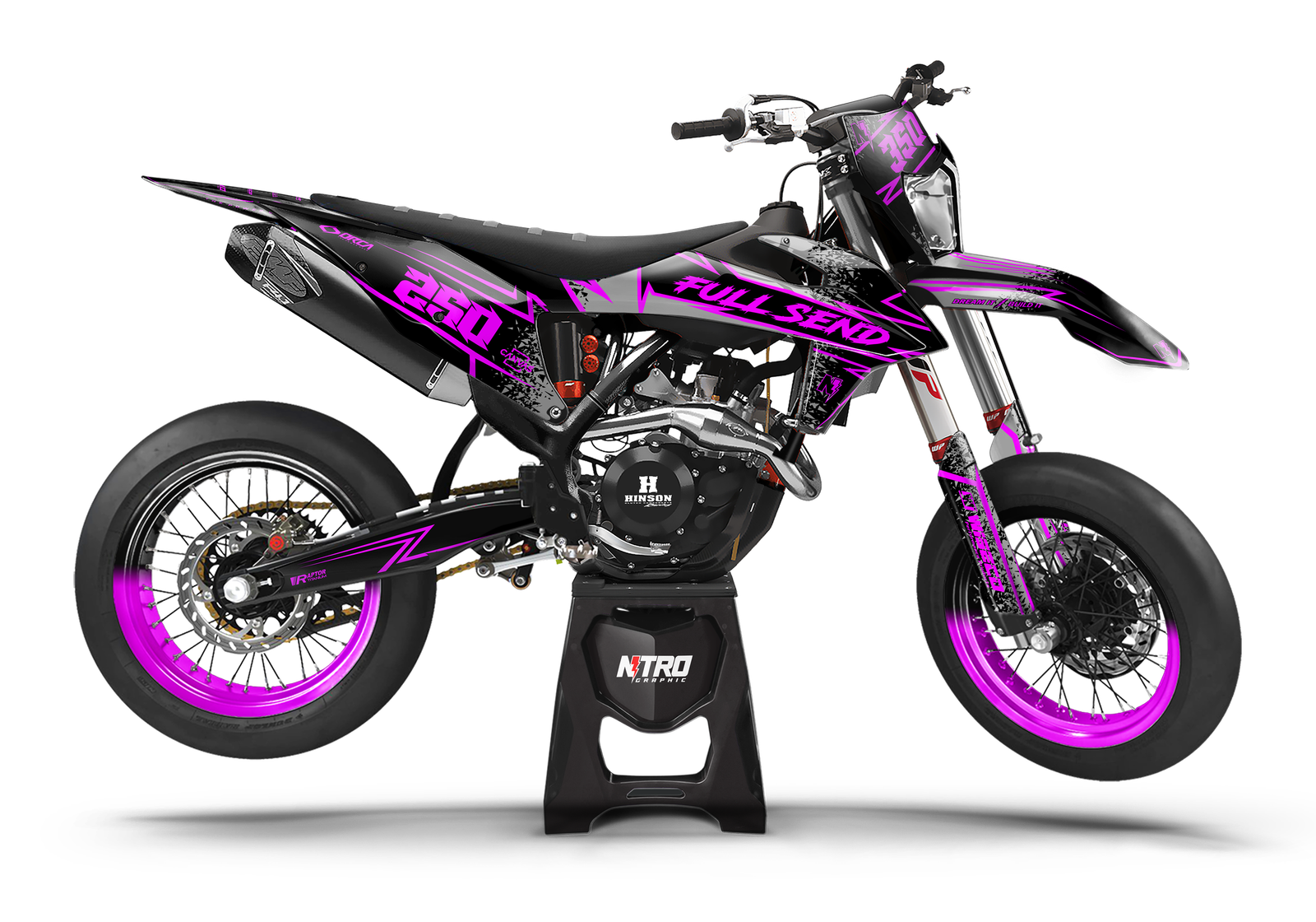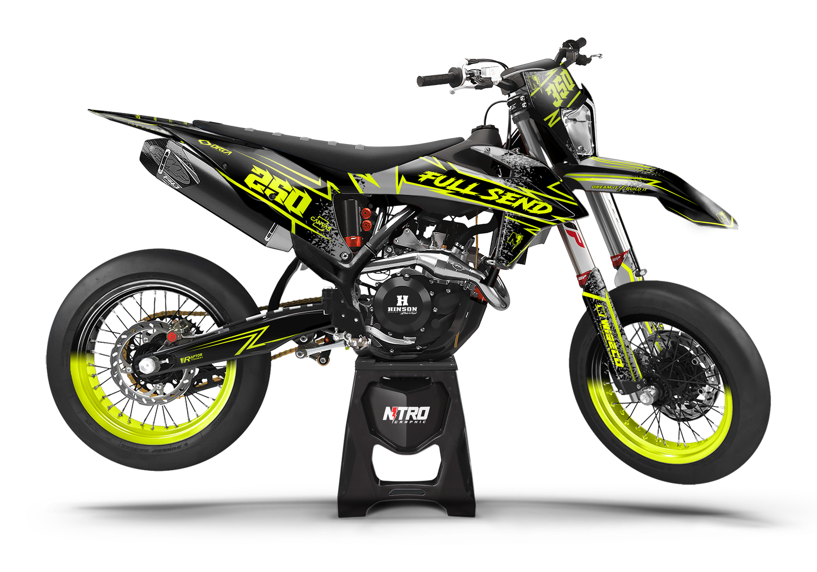 Full Graphics Kits include pre-designed template graphics for – Tank Shrouds / Fuel Tank, Side Number Plates, Airbox, Rear Fender, Front Fender, Front Number Plate Fork Guards, and Swingarms (Contents may vary dependant on Type / Model selected).