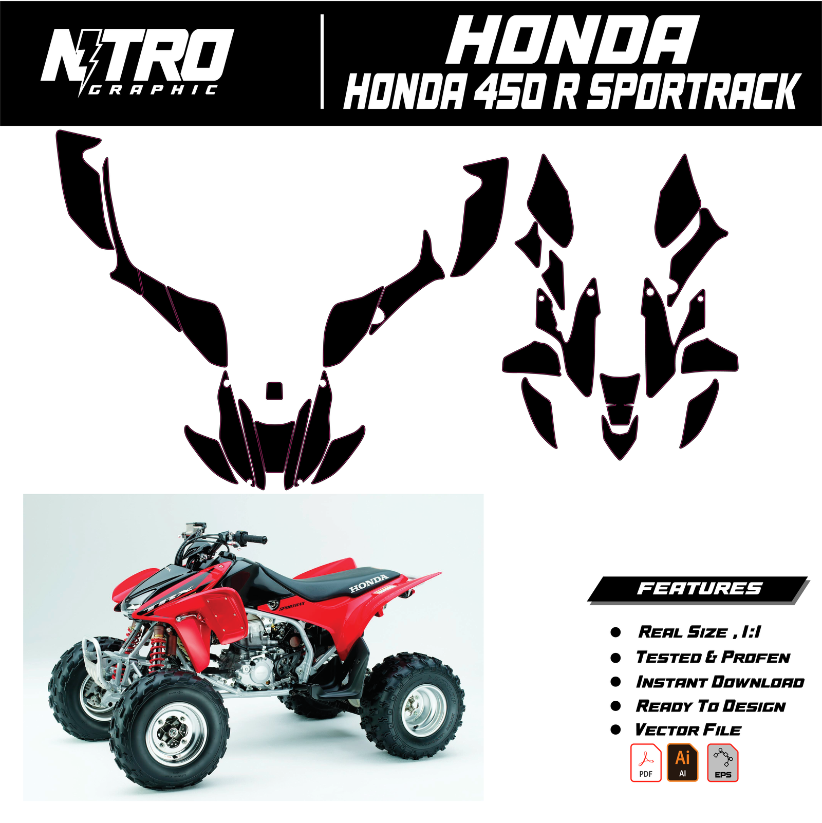 Our HONDA 450 R SPORTRACK QUADS ATV Templates are manufactured to be easily placed on your vehicle and make it 100% unique. Our Vector Template is available in digital format. It is designed to be simply used with your graphic design software (Illustrator, Photoshop, Corel Draw, etc.).