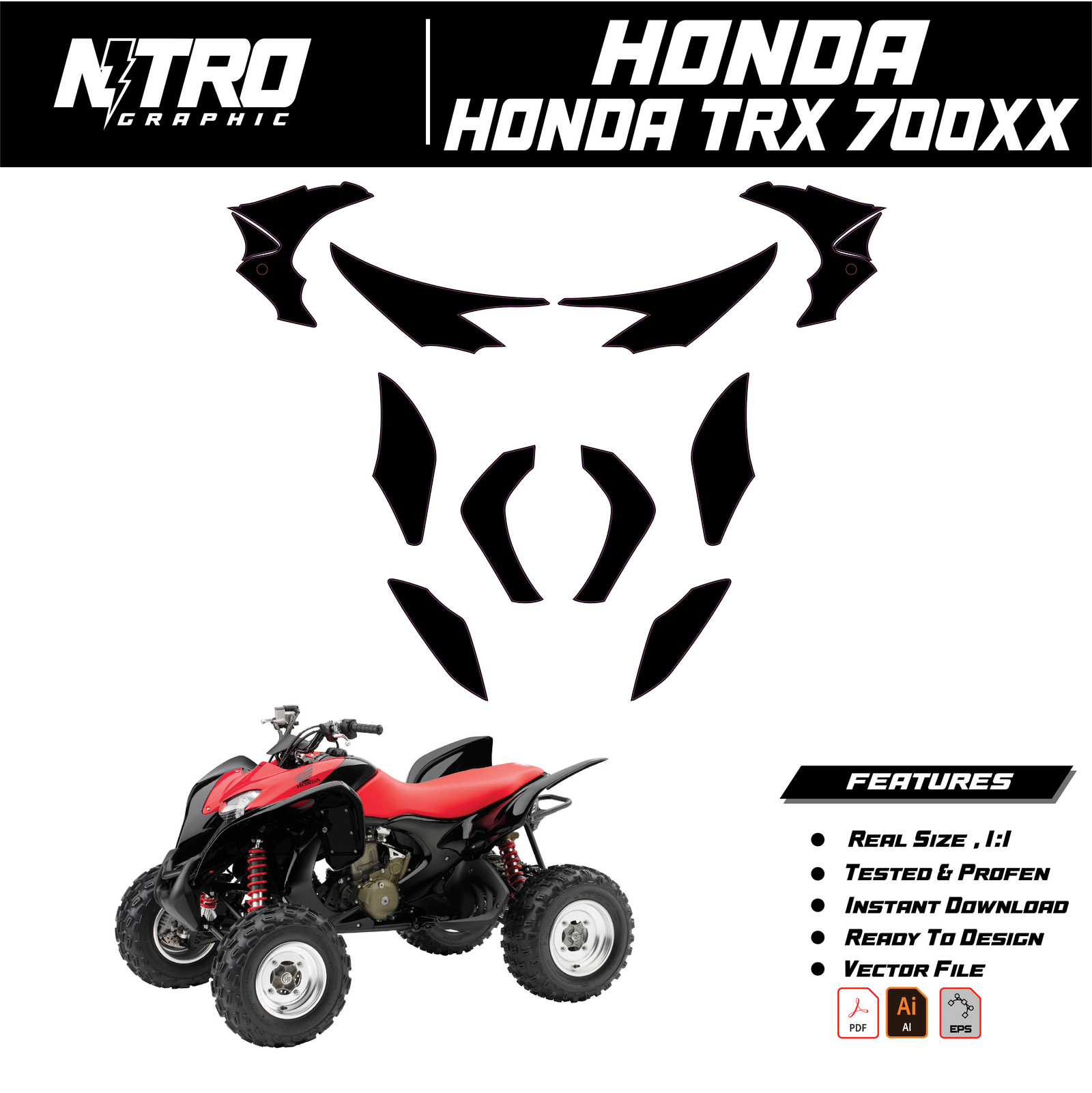 Our HONDA TRX 700XX QUADS ATV Templates are manufactured to be easily placed on your vehicle and make it 100% unique. Our Vector Template is available in digital format. It is designed to be simply used with your graphic design software (Illustrator, Photoshop, Corel Draw, etc.).