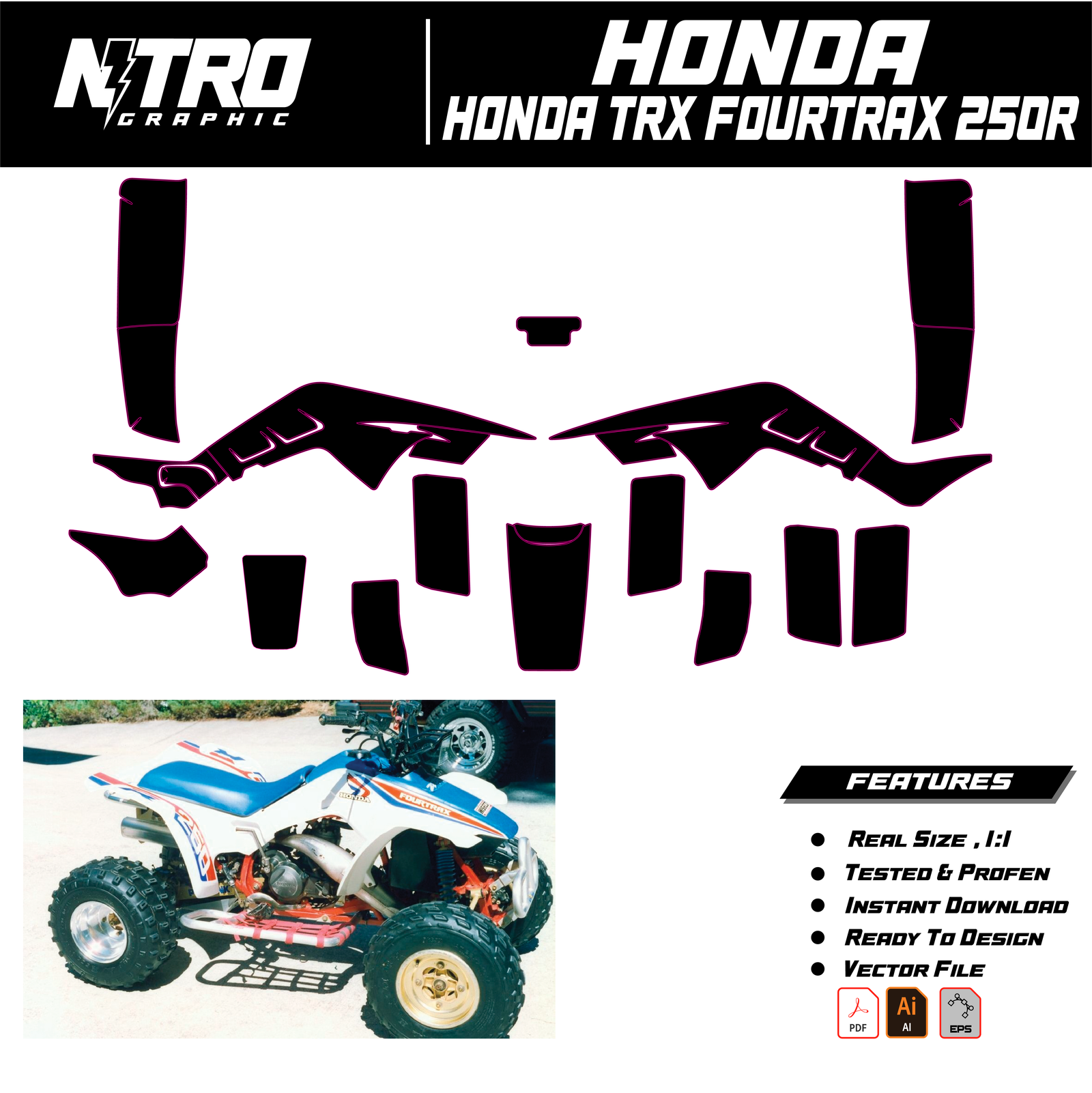 Our HONDA TRX FOURTRAX 250R QUADS ATV Templates are manufactured to be easily placed on your vehicle and make it 100% unique. Our Vector Template is available in digital format. It is designed to be simply used with your graphic design software (Illustrator, Photoshop, Corel Draw, etc.).