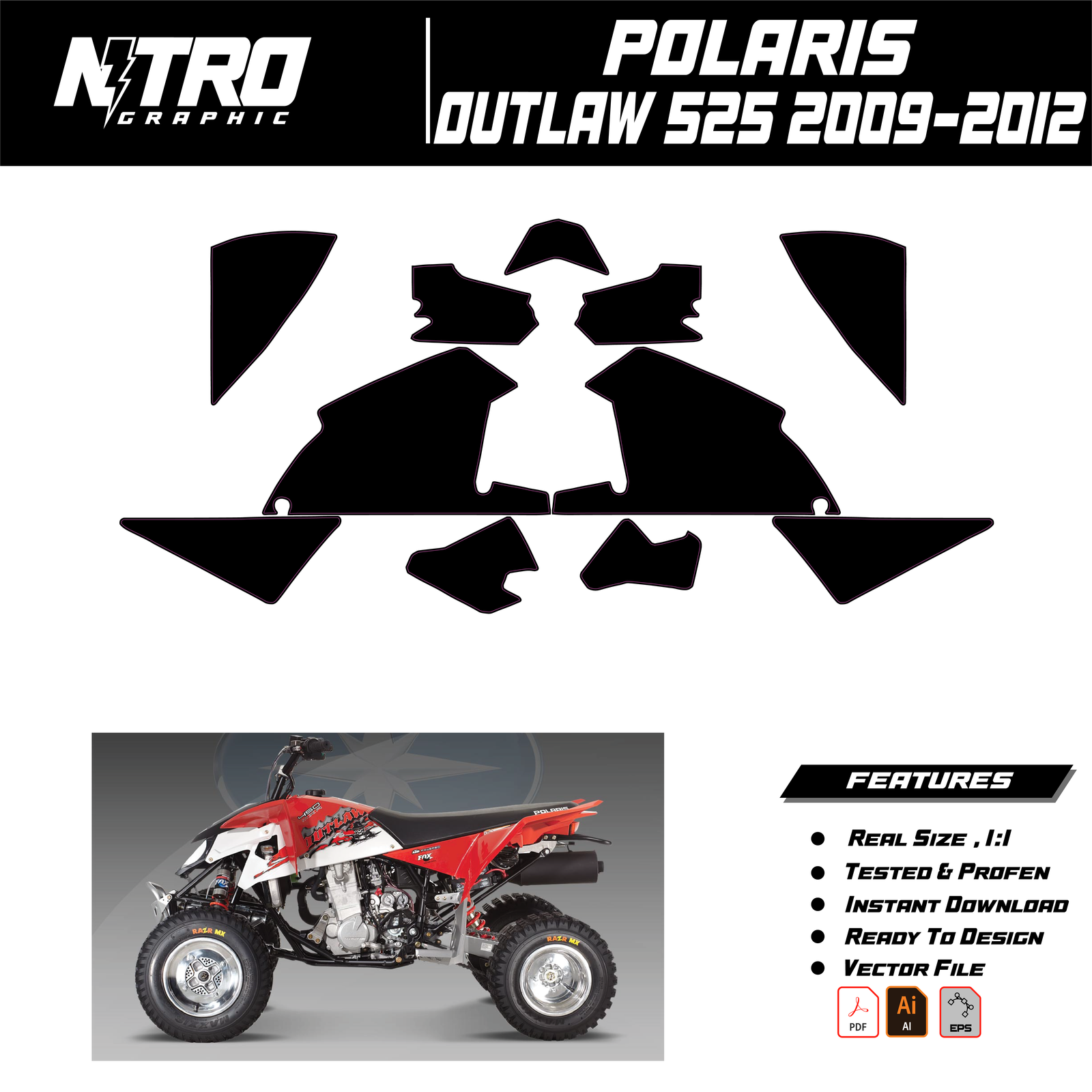 Our POLARIS OUTLAW 525 2009 2010 2011 2012 QUADS ATV Templates are manufactured to be easily placed on your vehicle and make it 100% unique. Our Vector Template is available in digital format. It is designed to be simply used with your graphic design software (Illustrator, Photoshop, Corel Draw, etc.).