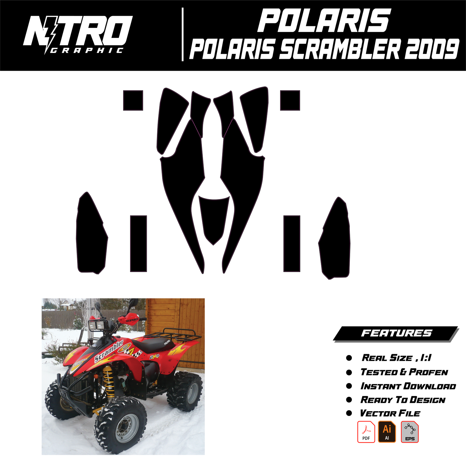 Our Polaris Scrambler 2009 QUADS ATV Templates are manufactured to be easily placed on your vehicle and make it 100% unique. Our Vector Template is available in digital format. It is designed to be simply used with your graphic design software (Illustrator, Photoshop, Corel Draw, etc.).