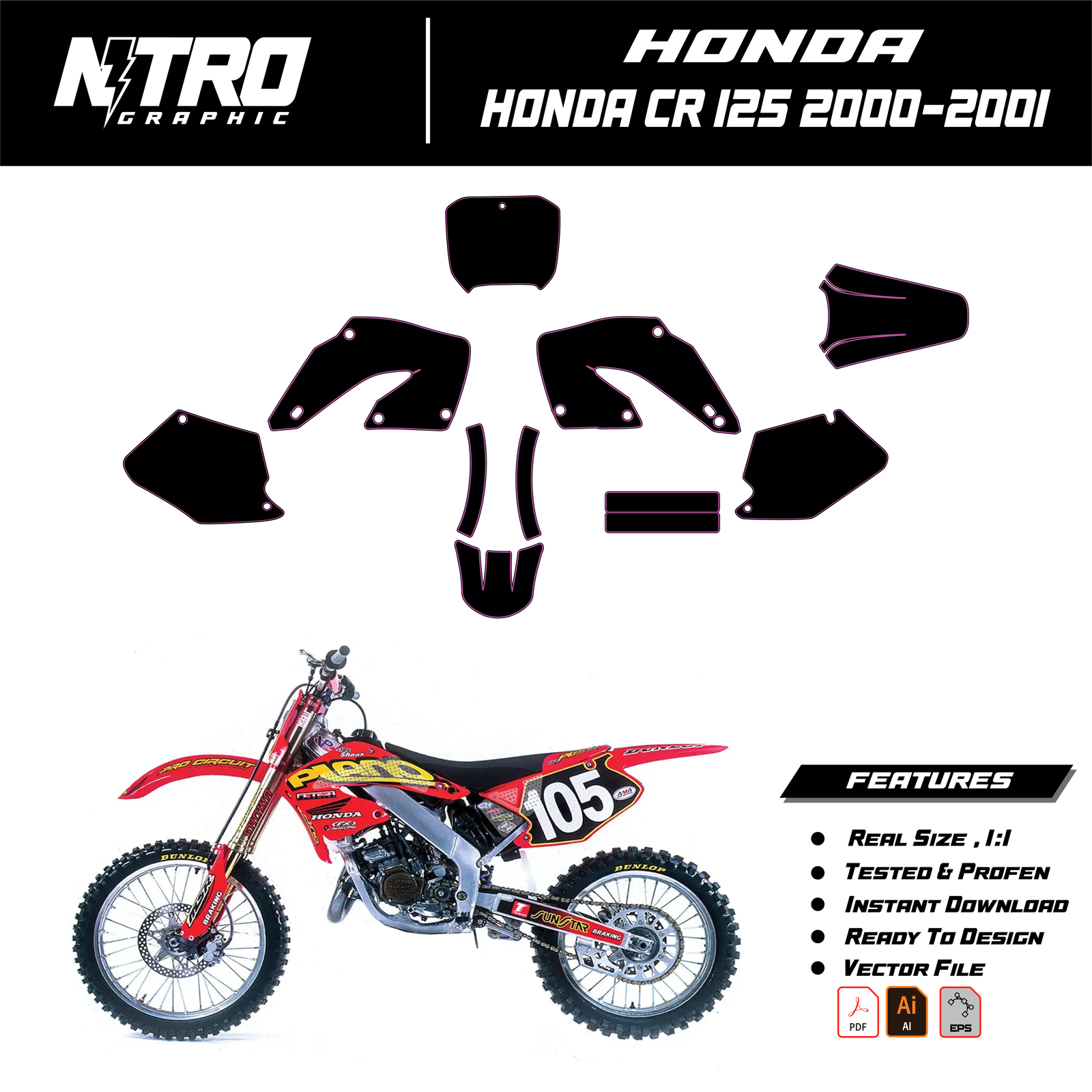 Our HONDA CR 125 2000-2001 Templates are manufactured to be easily placed on your vehicle and make it 100% unique. Our Vector Template is available in digital format. It is designed to be simply used with your graphic design software (Illustrator, Photoshop, Corel Draw, etc.).