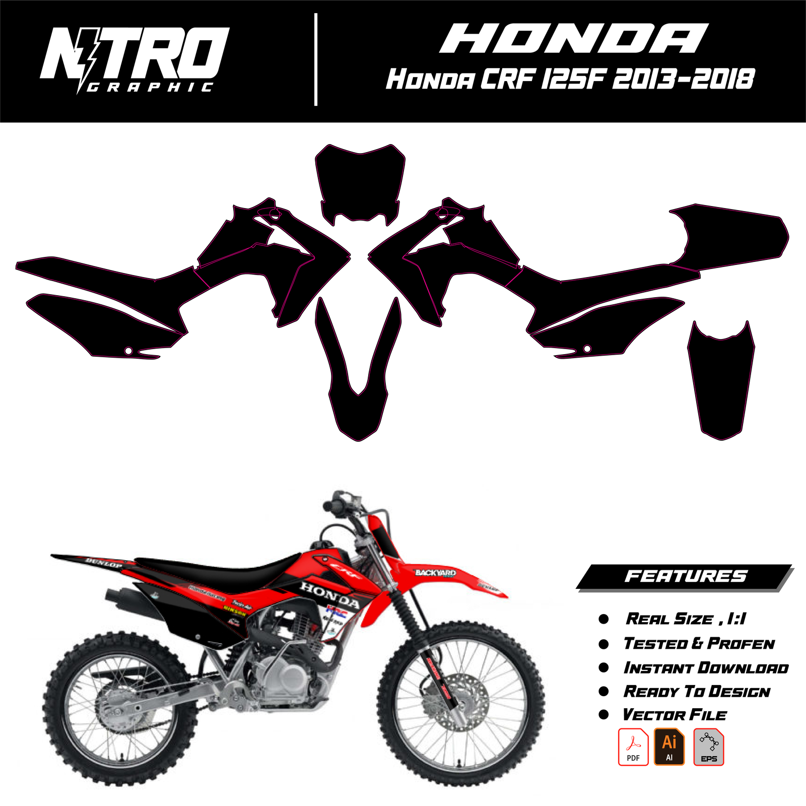 Our Honda CRF 125F 2013 2014 2015 2016 2017 2018 Templates are manufactured to be easily placed on your vehicle and make it 100% unique. Our Vector Template is available in digital format. It is designed to be simply used with your graphic design software (Illustrator, Photoshop, Corel Draw, etc.).