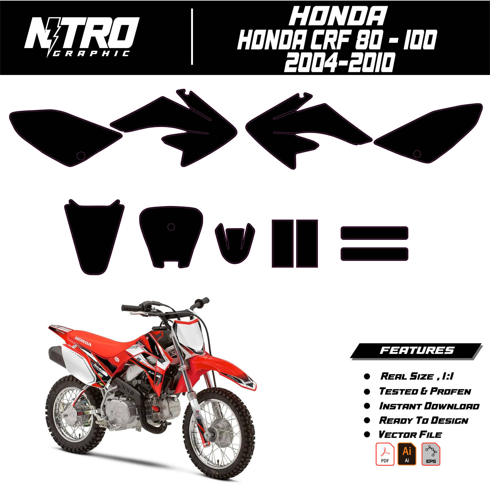 Our Honda CRF 80 – 100 2004 2005 2006 2007 2008 2009 2010 Templates are manufactured to be easily placed on your vehicle and make it 100% unique. Our Vector Template is available in digital format. It is designed to be simply used with your graphic design software (Illustrator, Photoshop, Corel Draw, etc.).