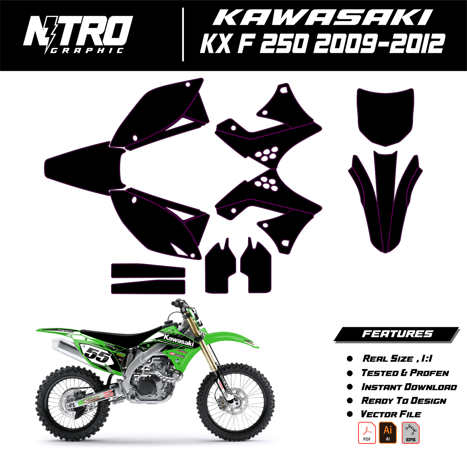 Our KAWASAKI KX F 250 2009 2010 2011 2012 Templates are manufactured to be easily placed on your vehicle and make it 100% unique. Our Vector Template is available in digital format. It is designed to be simply used with your graphic design software (Illustrator, Photoshop, Corel Draw, etc.).