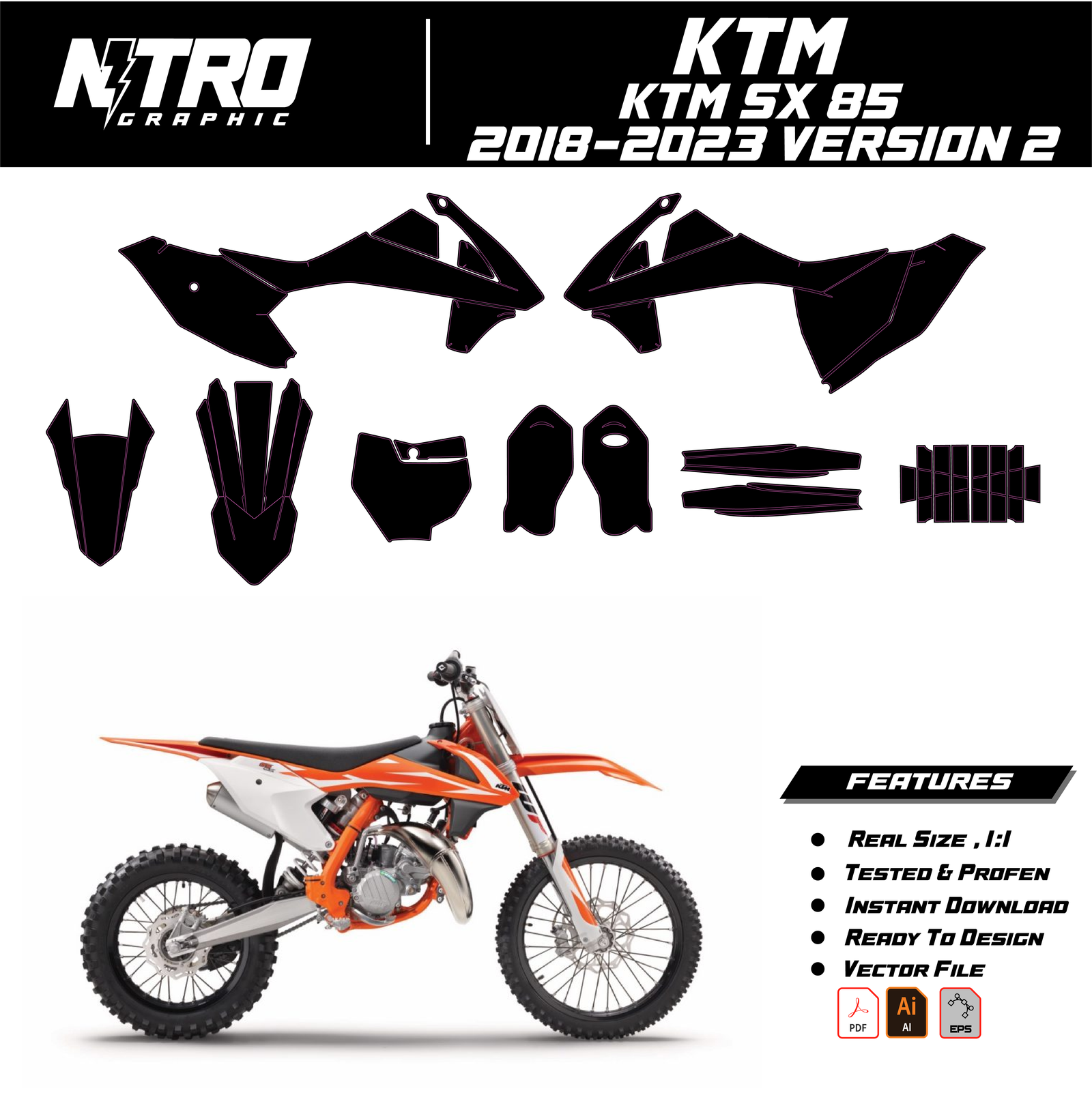 Our KTM SX 85 2018 2019 2020 2021 2022 2023 VERSION 2 Templates are manufactured to be easily placed on your vehicle and make it 100% unique. Our Vector Template is available in digital format. It is designed to be simply used with your graphic design software (Illustrator, Photoshop, Corel Draw, etc.).
