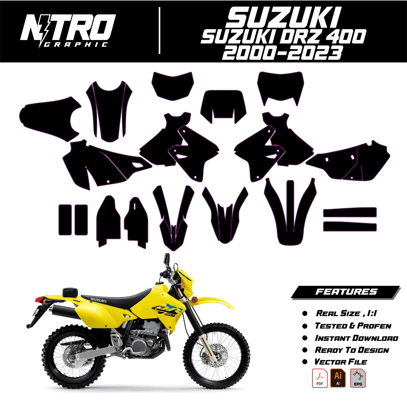 Our Suzuki DRZ 400 2000-2023 Templates are manufactured to be easily placed on your vehicle and make it 100% unique. Our Vector Template is available in digital format. It is designed to be simply used with your graphic design software (Illustrator, Photoshop, Corel Draw, etc.).