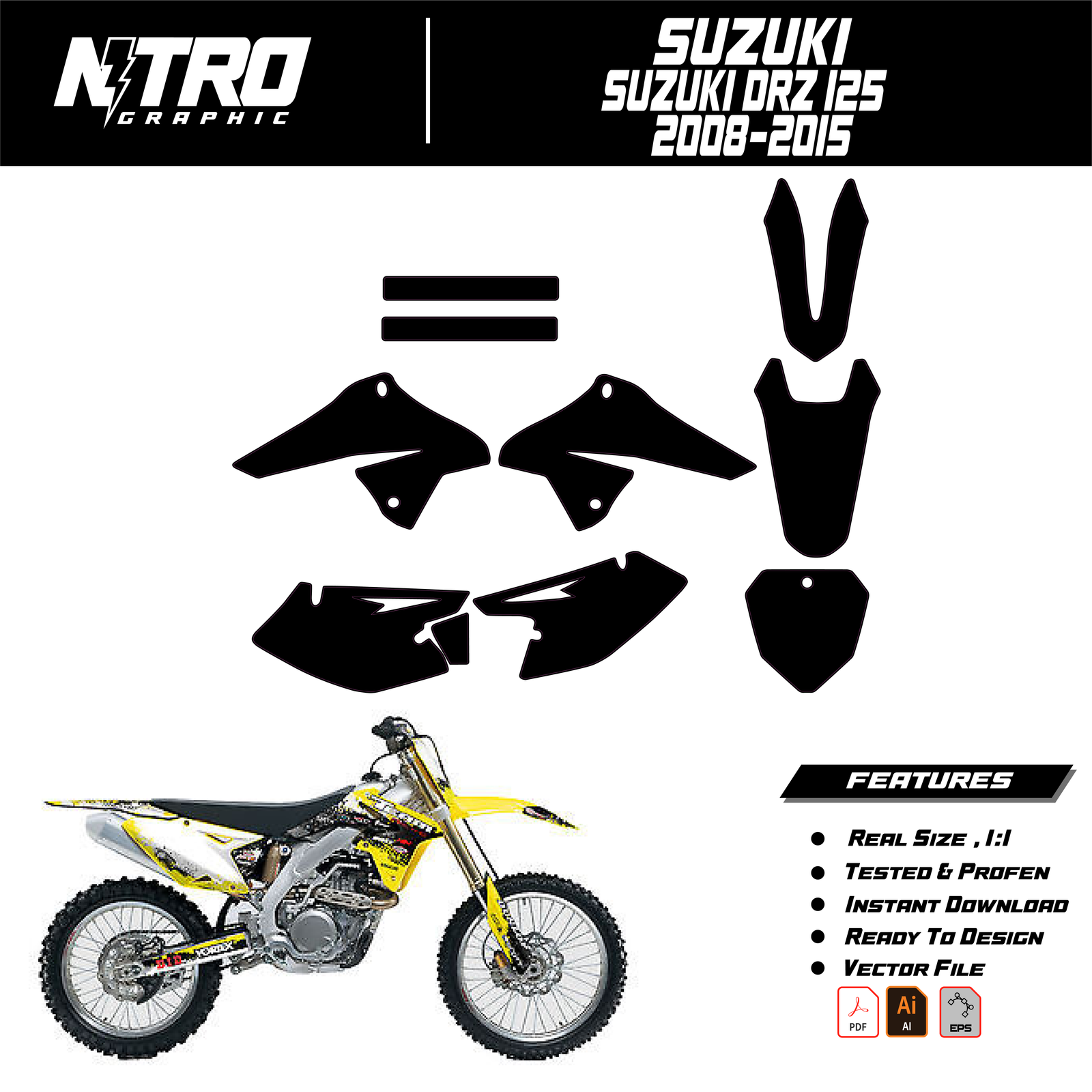 Our SUZUKI DRZ 125 2008 2009 2010 2011 2012 2013 2014 2015 Templates are manufactured to be easily placed on your vehicle and make it 100% unique. Our Vector Template is available in digital format. It is designed to be simply used with your graphic design software (Illustrator, Photoshop, Corel Draw, etc.).