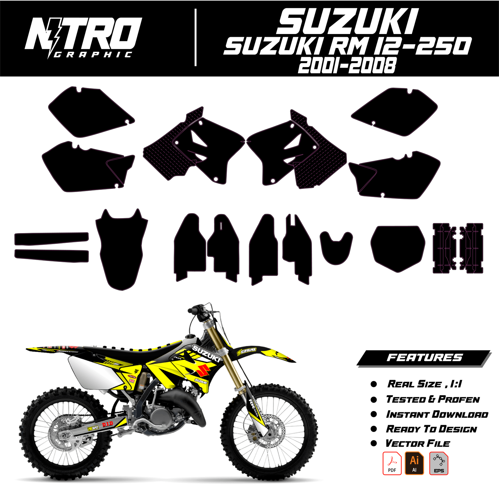 Our Suzuki RM 12-250 2001 2002 2003 2004 2005 2006 2007 2008 Templates are manufactured to be easily placed on your vehicle and make it 100% unique. Our Vector Template is available in digital format. It is designed to be simply used with your graphic design software (Illustrator, Photoshop, Corel Draw, etc.).