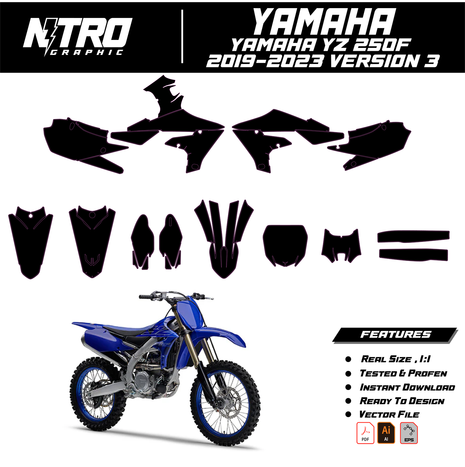 Our Yamaha YZ 250F 2019 2020 2021 2022 2023 Templates are manufactured to be easily placed on your vehicle and make it 100% unique. Our Vector Template is available in digital format. It is designed to be simply used with your graphic design software (Illustrator, Photoshop, Corel Draw, etc.).